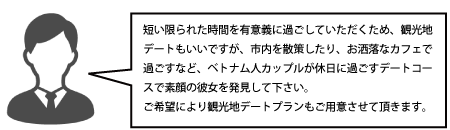 午前中関西国際空港より出国 ⇒ 夕方ベトナムに入国 ⇒ ホテルにチェックイン ⇒ 休憩後3名以内の女性とお見合い ⇒ 実際会ってフィーリング再確認 ⇒ 女性に気持ちを伝える ⇒ 女性のOKが出れば夕食を一緒に楽しめます!